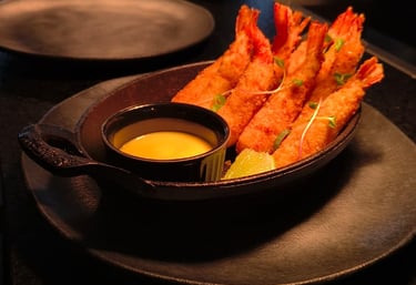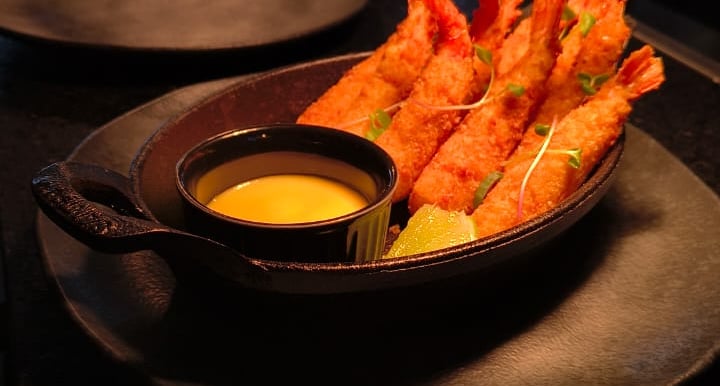 Camarão GG empanado na farinha panko. Acompanha molho de manga