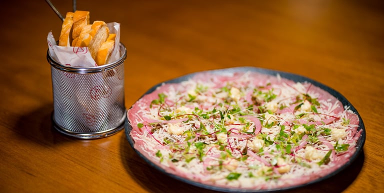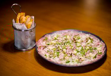 Filé mignon, molho da casa, picles, alcaparras, cebola roxa, maionese de osso e chips de batatas