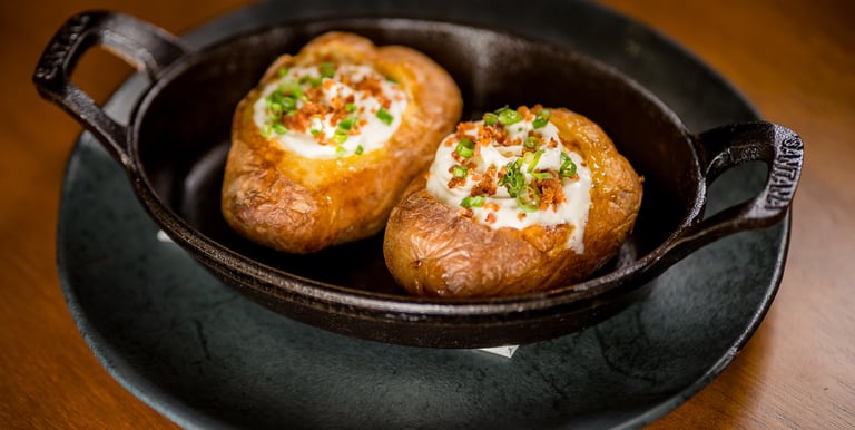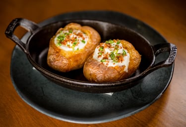 Batata assada, rechada com sour cream, crispy de bacon e cebolinha.